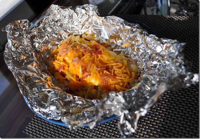 When you’re done grilling, top with bacon (the refrigerated kind…is there any other way?) and shredded cheese. Enjoy!