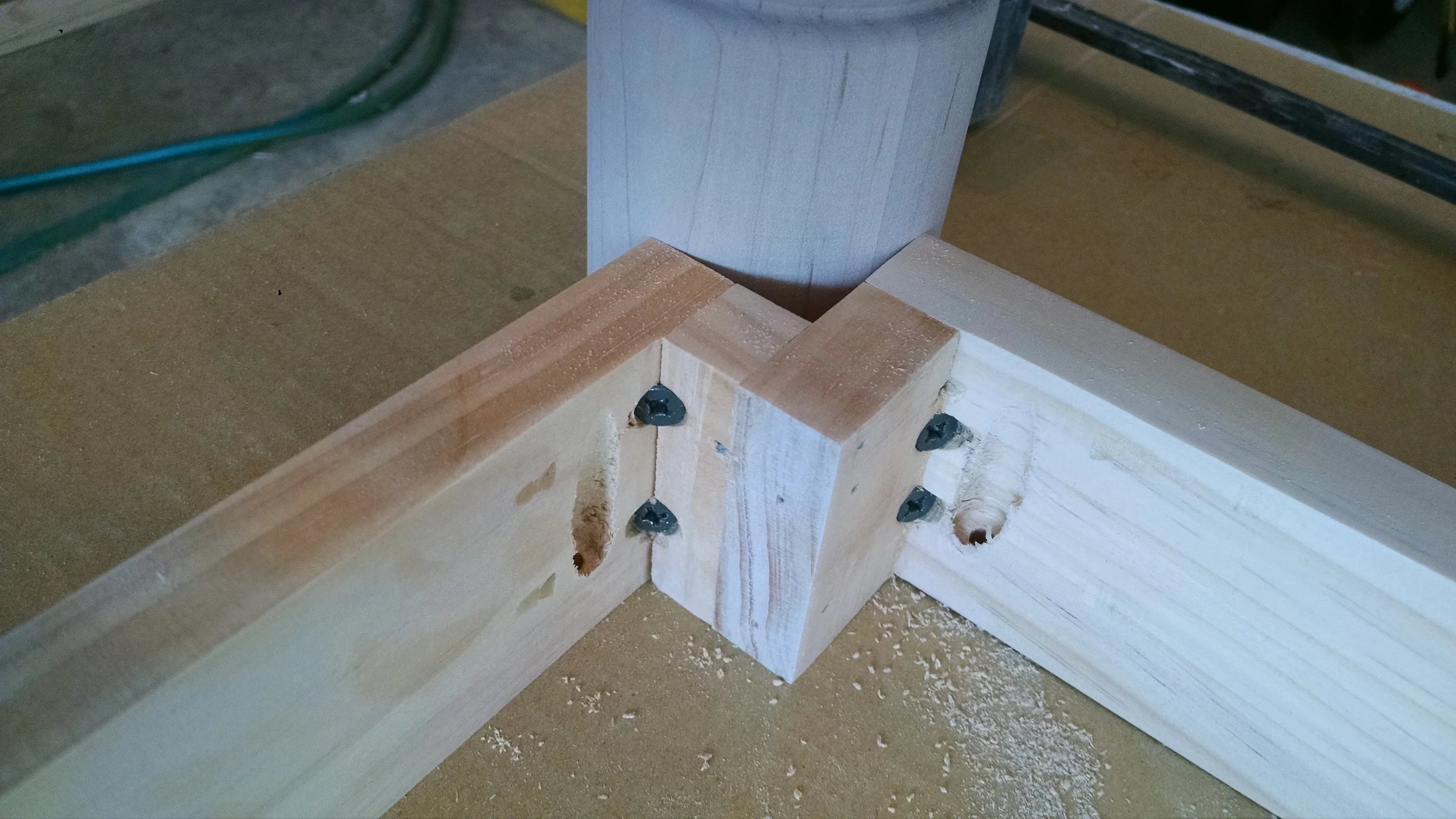 Place each leg into the corner that was created, using a clamp as needed to keep the leg securely into the corner. Drill pilot holes into each corner from the inside of the boards into the leg. Attach with 2 1/2" wood screws. Repeat on each leg.