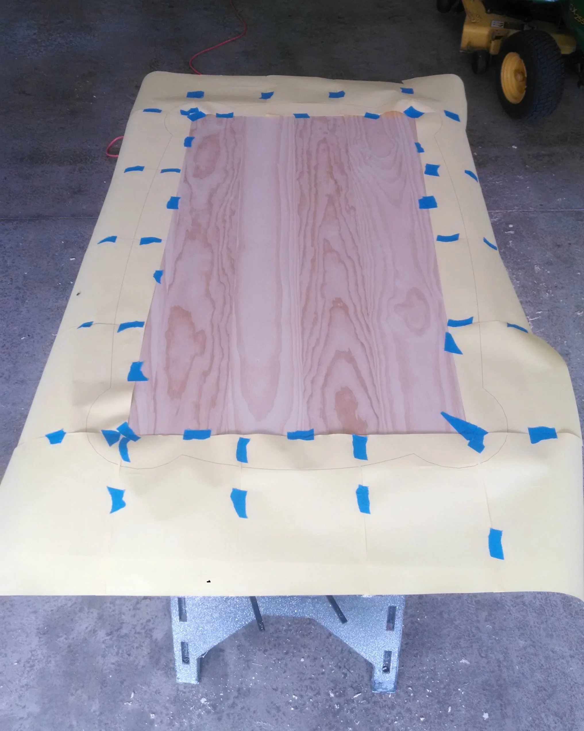 Once it is all printed, tape together matching all the lines. Tape this to the top of the created board, only taping on the inside. This will allow you to lift from the outside and put carbon tracing paper under the printed document. Trace the design with the carbon paper.