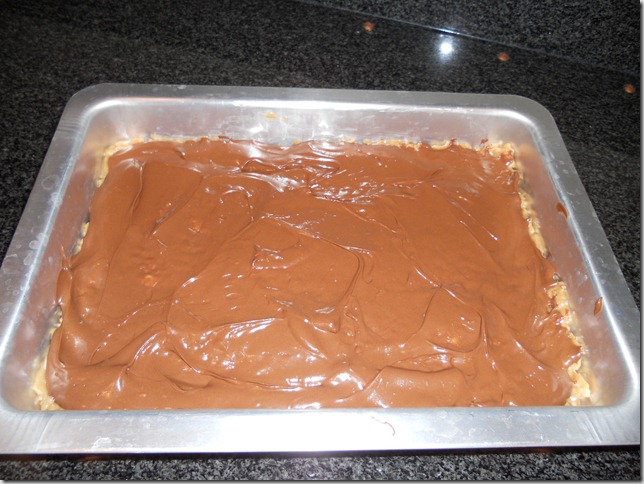 Melt chocolate chips and butterscotch chips. Spread over bars. Cut when set.