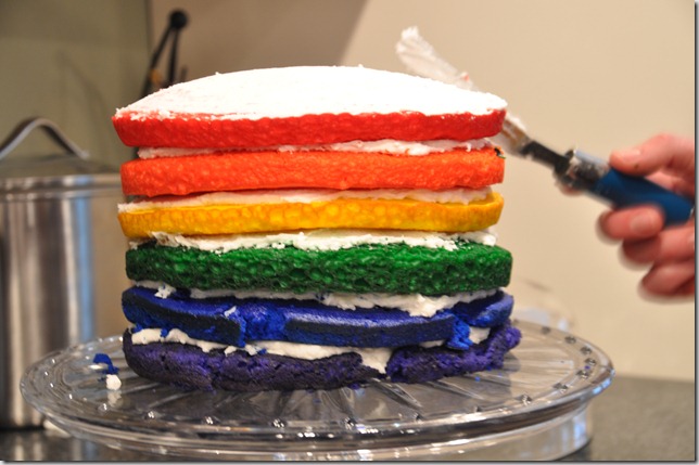 Words of wisdom from the ancient one: Grease your pans VERY well…or this cake becomes a mess. (See purple and blue layer below.) Use a knife to loosen the edges. Let cool until you can touch the pan. CAREFULLY flip onto a wire rack to cool completely.