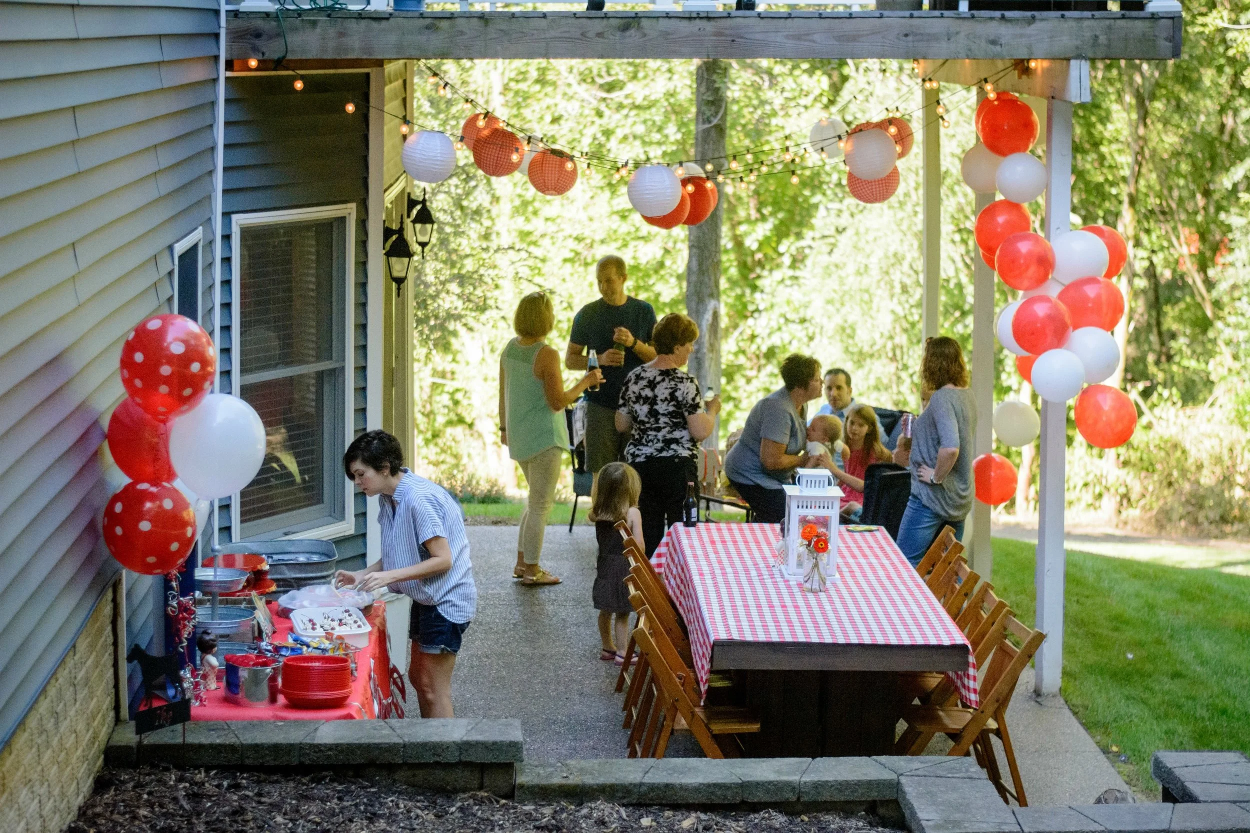 Nate and my brother set up this "balloon wall" the morning of the party. They tied up balloons on some red and white Baker's twine. It was a little breezy that day and we were going to anchor them using a string across the bottom of the posts but we ended up being too worried about little feet tripping.